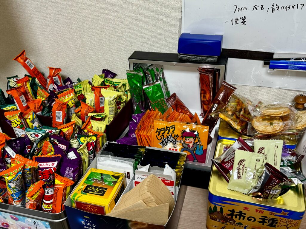 事務局のお菓子コーナーが充実しました。高級感は皆無ですが笑、作業の合間にひと息つく場があります。もちろん仕入れ先は府中の市場、大東京綜合卸売センターです。水産、精肉、青果から日用品にお菓子などなんでも揃う市場です。美味しい食事もありますのでぜひみなさん一度府中の市場大東京綜合卸売センターへ行かれてみてください。