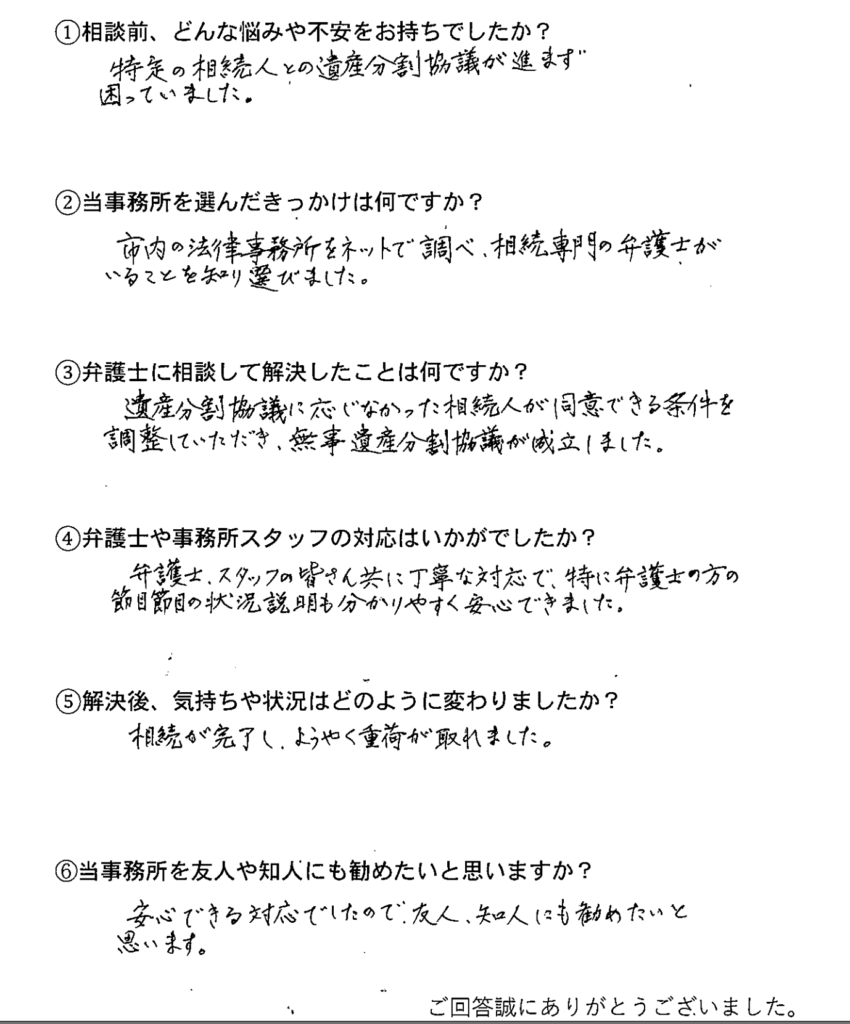 「他事務所で止まっていた遺産分割協議が、こちらに依頼してからすぐ進展した」