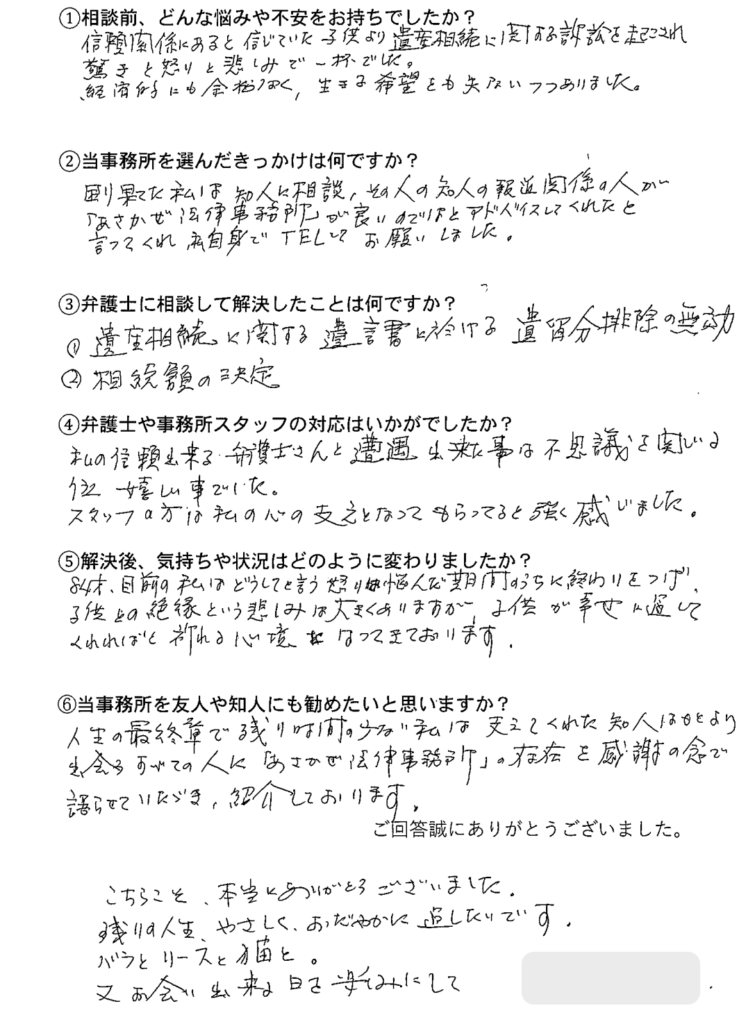 ご依頼者は、永年寄り添った配偶者に遺言で廃除(相続人の地位から離脱)するという現実に直面しました。「驚きと怒りと悲しみで胸がいっぱいでした。」「経済的にも余裕がなく、生きる希望さえ失ないつつありました。」と当時のご心境を吐露されています。